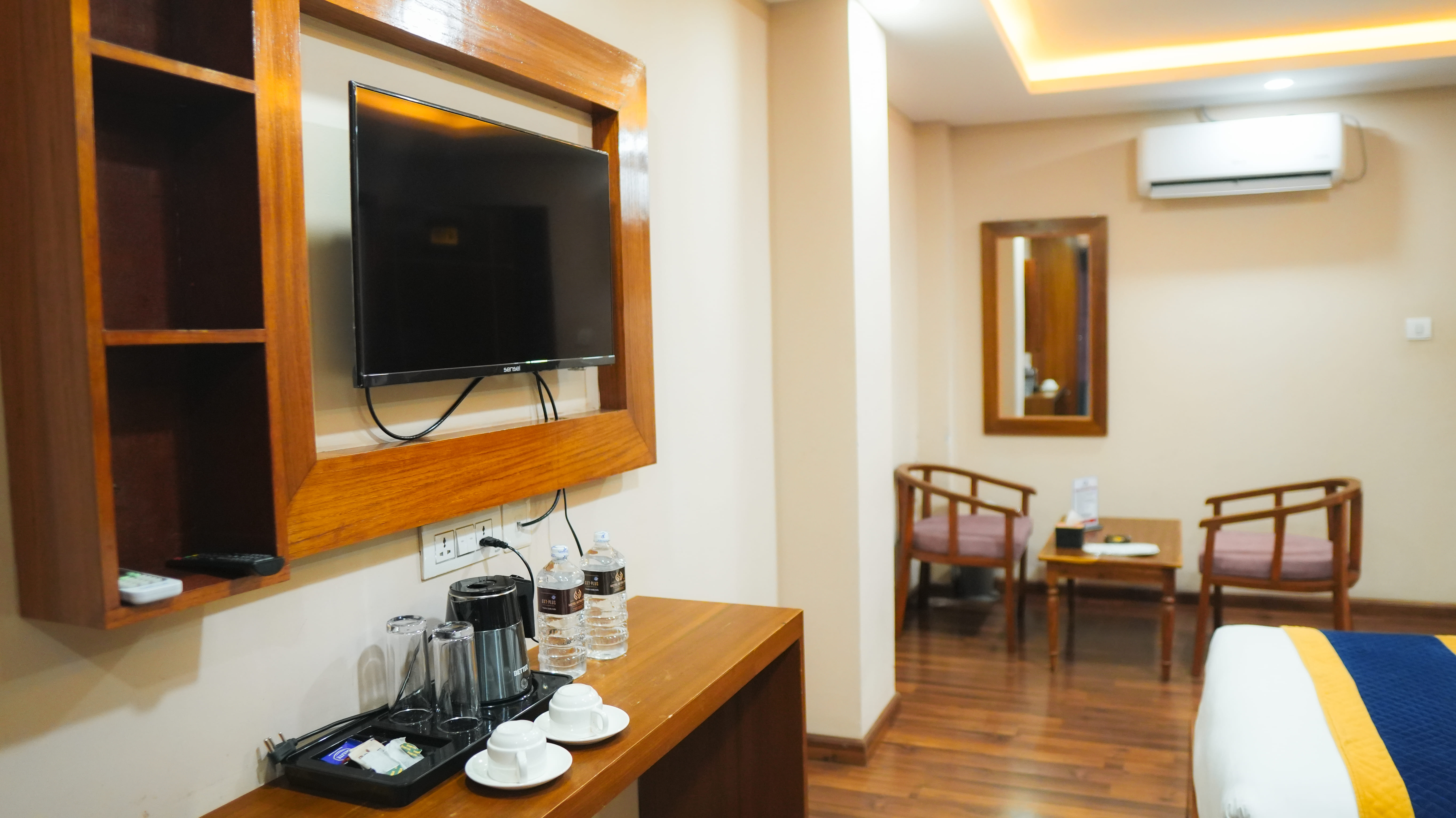 Free Wi-Fi, smart TV, wardrobe, attached bath, and climate control.